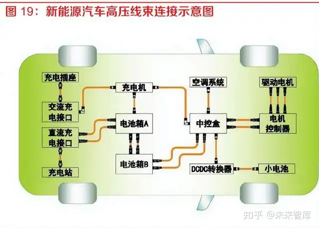 在传统低压线束以外,新能源汽车以高压电池包为动力来源,新增高压线束为传输载体。汽车线 束是控制汽车电气和电子元件功能的主要载体,是汽车的血管和神经,为各电子元件提供动力、 传递和反馈信号。根据汽车线束耐电压高低可以分为低压线缆和高压线缆,传统燃油车主要应用 低压线缆,而电动车线束新增了高压线缆,其承载电压约为 600V。新能源汽车尤其是纯电动汽车, 动力来源靠高压电池包提供,传输载体为高压线束,连接充电口座、高压电池包、逆变器、电机, 车载充电机等大功率设备。高压线束主要包括:高压连接器、高压线缆,接地端子和扎带、外包 材料、胶带、热缩套管、胶套、安装支架等辅材。