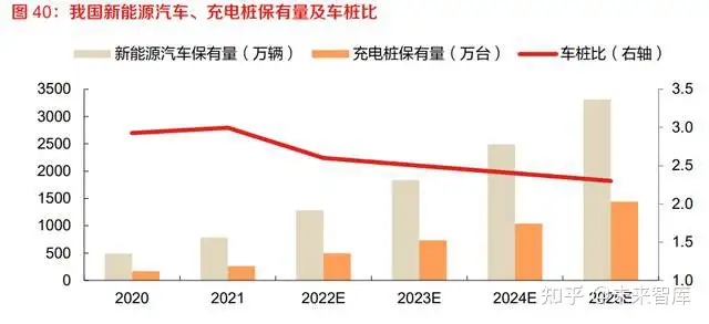 预计 2025 年我国的充电桩数量将达到 1440 万台,车桩比逐渐降至 1:2.3。根据中国电动汽车充 电基础设施促进联盟(EVCIPA)数据,截至 2021 年底,公共充电桩共计 114.7 万台,其中直流 充电桩 47.0 万台,交流充电桩 67.7 万台;我国 2021 年底的新能源起车保有量为 784 万辆,车桩 比为 1:3。预计 2022 年我国新增充电桩 244 万台,届时我国新能源汽车保有量达到 1314万辆, 车桩比降至 1:2.6。我们预计至 2025 年我国的新能源汽车保有量达到 3312 万辆,车桩比逐渐降 至 1:2.3,则 2025 年我国的充电桩数量将达到 1440 万台。