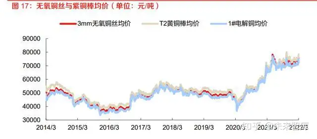 预计至 2025 年,我国电动汽车电机用铜杆市场规模将达到 80 亿元,2021-2025 年复合增速 32%。 随着扁线电机渗透率的逐渐提高,我国扁线电机用无氧铜杆的市场规模将逐步扩大至 68 亿元,而 圆线电机用低氧铜杆的市场规模将逐步缩小至 12 亿元。预计至 2025 年,我国电动汽车电机用铜 杆市场规模将达到 80 亿元,2021-2025 年复合增速 32%。(报告来源:未来智库)