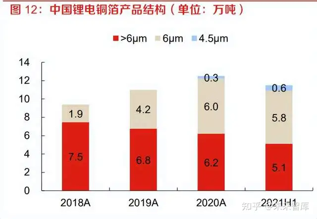 动力锂电向高能量密度方向发展的趋势已定,对锂电铜箔极薄化提出了高要求。宁德时代、比亚 迪等动力锂电池龙头企业 6μm 锂电铜箔已应用成熟并快速切换,其他动力锂电池企业也在加速 6μm 锂电铜箔的应用,≤6μm 极薄锂电铜箔产品已逐步在龙头企业中开展应用。据 GGII 统计, 2020 年≤6μm 锂电铜箔渗透率为 50.4%,2021 年上半年,渗透率已经达到 55.6%。在电池厂商 高能量密度及降低成本的要求下,继 6μm 锂电铜箔之后,4.5μm 锂电铜箔未来有望成为主流产品 之一,据高工锂电获悉,宁德时代2021年上半年每月的4.5μm锂电铜箔用量为600-700吨左右, 2021 年下半年宁德时代对 4.5μm 锂电铜箔的月需求量或继续增加。