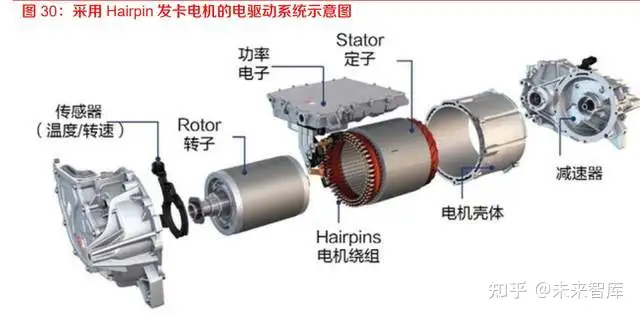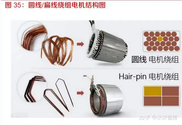 绕组扁线化(Hair-pin 电机)或将成为驱动电机的一个发展趋势。为了在有限的体积内,提升车 辆的动力性、经济性,驱动电机不断的朝着高功率密度、高电机效率方向发展。扁线绕组电机显 著特点是定子绕组中采用扁铜线,先把绕组做成类似发卡一样的形状,穿进定子槽内,再在另外 一端把发卡的端部焊接起来。相比传统圆线电机,扁线电机通过应用截面积更大的扁铜线,提高 电机槽满率,具有高功率/转矩密度、高效率、散热性能更好等优点,同时更易于实现自动化生产, 满足新能源乘用车市场爆发后对产品一致性高的要求。