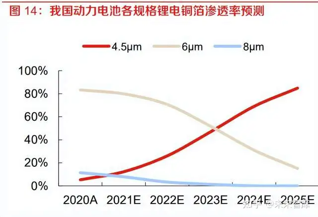 预计 2021-2025 年国内动力电池 4.5μm 锂电铜箔的渗透率将提升,6μm 渗透率下降。回顾 2015 年以来我国动力电池 ≤6μm 锂电铜箔的渗透率,可以拟合成一条 S 型增长曲线。随着新能源汽车需求的进一步增强, 以及锂电铜箔更新迭代加速,未来动力电池 4.5μm 锂电铜箔或将经历类似的渗透率提升过程。我 们预计 2021-2025 年,国内动力电池 4.5μm 锂电铜箔的渗透率将从 12%提升至 85%,在一定程 度上挤压 6μm 锂电铜箔的空间,国内动力电池 6μm 锂电铜箔的渗透率将从 80%降至 15%。