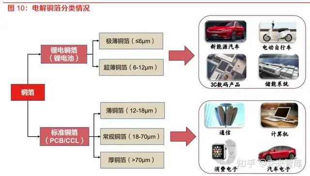 锂电池负极目前多采用 8μm 以下厚度的锂电铜箔。根据应用领域的不同,电解铜箔可以分为应用 于印制电路板的电子电路铜箔,以及应用于锂电池的锂电铜箔;根据铜箔厚度不同,按照通行标 准可以分为极薄铜箔(≤6μm)、超薄铜箔(6-12μm)、薄铜箔(12-18μm)、常规铜箔(18- 70μm)和厚铜箔(>70μm)。锂电铜箔目前多采用 8μm 以下的铜箔产品,而电子电路铜箔一般 较锂电铜箔更厚,大多在 12-70μm。