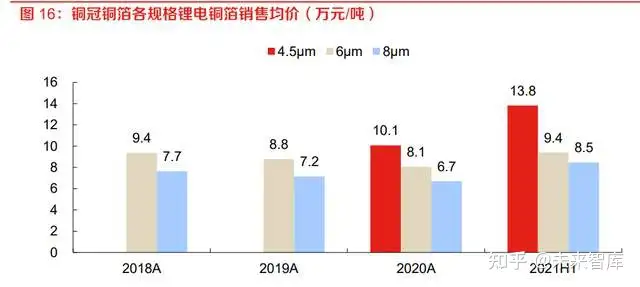 2021 年以来我国电动汽车需求旺盛,各规格锂电铜箔价格明显上涨。据安徽铜冠铜箔集团招股书 说明书披露,2021 年以来各规格锂电铜箔价格明显上涨。从 2020 年至 2021 年上半年,8μm 锂 电铜箔的销售均价由 6.7上涨至 8.5万元/吨,6μm锂电铜箔的销售均价由 8.1上涨至 9.4万元/吨。 4.5μm 作为供应头部锂电池生产企业的高端产品,2021 年上半年的售价已达到 13.8 万元/吨,涨 幅最明显。随国内电动汽车锂电铜箔持续轻薄化,6μm 锂电铜箔已经成为行业主流,并且正在逐 步向 4.5μm 锂电铜箔切换。