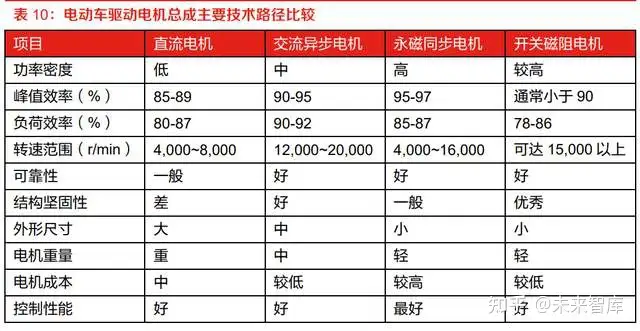 永磁同步电机和交流异步电机各有千秋。永磁同步电机本身具有转矩密度、功率密度、效率较高、 调速性能好等优点,再加上自身体积小、重量轻等优势,但它并不是没有缺点,除了原料带来的 成本问题外,它会有在高温下磁性衰减的问题,这也是为何中小型纯电动车不能进行长时间的高 速巡航。相对来讲,交流异步电机则具有结构简单、可靠性较高、拥有较好的高速性能以及加速 性能等优势;这也是一些以性能标榜的电动跑车以及中大型 SUV 会偏爱它的问题,如特斯拉 model S、model X、蔚来 ES8 等都在使用。不过相对来讲它的缺点则体现在转矩密度、功率密 度、效率密度偏低,并且还伴随着体积大、重量沉、发热量大的问题。总体来看,可以理解为搭 载永磁同步电动机的电动车续航相对更好一些,搭载交流感应电动机的电动车加速性能更好。