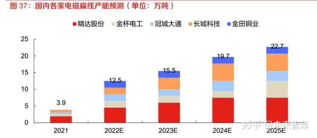 电磁扁线技术壁垒高,国内仅有 5 家铜加工企业能够量产,预计 2025 年达到 22.7 万吨年产能。 电磁扁线是扁线电机核心部件,根据功率的不同,一台驱动电机使用量大约在 7-10kg,约占扁线 永磁电机整体价值量的 17%。电磁扁线弯折成发卡(hair-pin)后,转角处的应力集中,容易导致 涂覆层破损,因此对铜线及其涂覆的精度和质量要求很高。目前国内仅精达股份等 5 家铜加工企 业能够量产电磁扁线。精达股份、金杯电工和长城科技均有较大的产能建设项目,预计至预计 2025 年,我国的电磁扁线产能将达到 22.7 万吨/年。