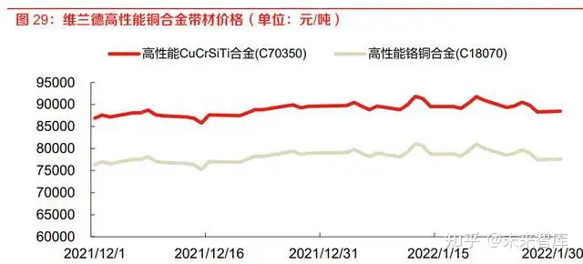 汽车高压线束系统若应用高性能铜合金线材,单车用铜的价值量约为 305 元。据国际铜业协会 (ICA)统计数据表面,每辆电动汽车(包括纯电动车、混动车、插电式混动车)的高压线束系 统重约 5kg,其中的高压线缆占比为 75%,重约 3.75kg。2021 年 12 月至 2022 年 1 月,维兰德 C70250 合金的平均售价为 8.13 万元/吨,则每台电动乘用车的高压线缆用铜合金的价值量约为 305 元。